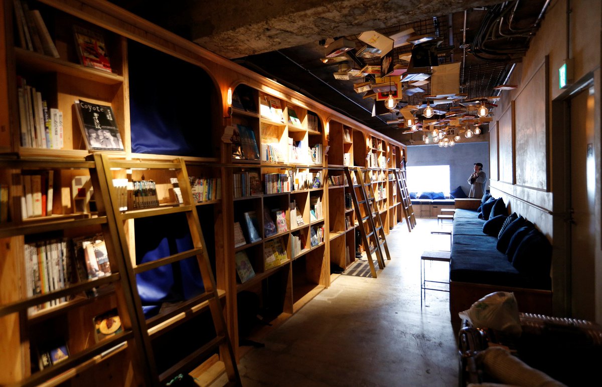 Curl up in a classic japanese capsule hotel with a bookish twist.